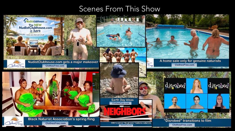 New show taped live from the Big Nude Boat! Interview - the new Nude Revolution! Also live from the largest naturist camp in the USA. Disney's cartoon nudist club. Plus More!